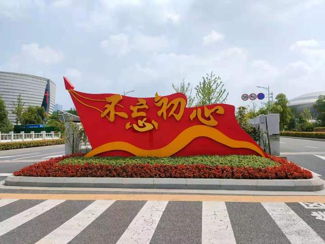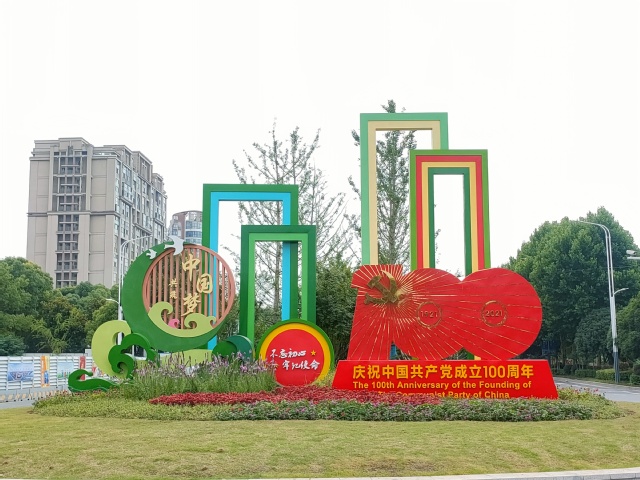 不忘初心來時路,同心共筑中國夢。位于建鄴區(qū)夢都大街揚子江大道路口高7米,占地面積100余平方米的主題景觀,在綠地基礎上突顯了“慶祝中國共產黨成立100周年”活動標識等黨建元素;中國傳統(tǒng)紋樣圖案、彩色立體門框的設計,賦予整件作品立足傳統(tǒng)、開放包容的內涵;蛇鞭菊、斑葉芒、彩葉草、夏堇等各式花卉錯落有致的鋪滿地面,烘托了喜迎建黨百年的喜慶氛圍。