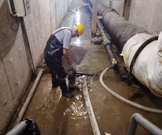 管廊處于地下五米,內(nèi)部干燥悶熱。此次檢修因在一平方米左右的受限空間內(nèi)操作,且蓄水池內(nèi)積水較多,無法下池檢修水泵具體的故障原因,工程人員立即采取措施接通備用水泵連接水帶,先將積水排出,并清理蓄水池里的垃圾。狹窄的蓄水池內(nèi)彌漫著異味,池內(nèi)能見度幾乎為零。幾經(jīng)探查,成功排查出止回閥已損壞。工作人員查明故障原因后,第一時間制定檢修方案,順利完成了搶修,此時汗水已經(jīng)完全濕透了他們的工作服。