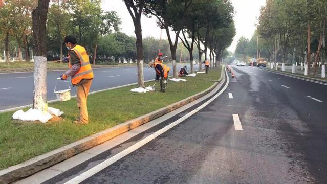 公司嚴(yán)格要求刷白“精細(xì)化”養(yǎng)護(hù)標(biāo)準(zhǔn),首先根據(jù)喬木、花卉類樹木的特性,區(qū)別了刷白高度;其次,在刷白時采取了墊襯措施,確保地面和地被植物干凈美觀;最后,按照止口平整,高度一致,刷白均勻,不留死角的要求,在城區(qū)多主干道和公園同時開展刷白工作。