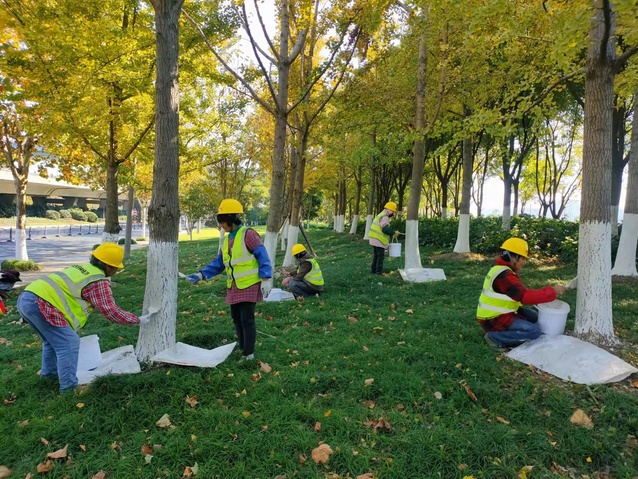 對樹木進(jìn)行刷白是冬季園林綠化養(yǎng)護(hù)管理的一項重要工作,樹木刷白主要有兩個作用:一是防凍,用石灰漿涂白后可以降低樹干晝夜溫差,減輕樹木凍害;二是防止蟲害,石灰漿和硫磺等具有殺菌作用,可以有效地防止蟲害,為樹木來年萌發(fā)打基礎(chǔ)。
