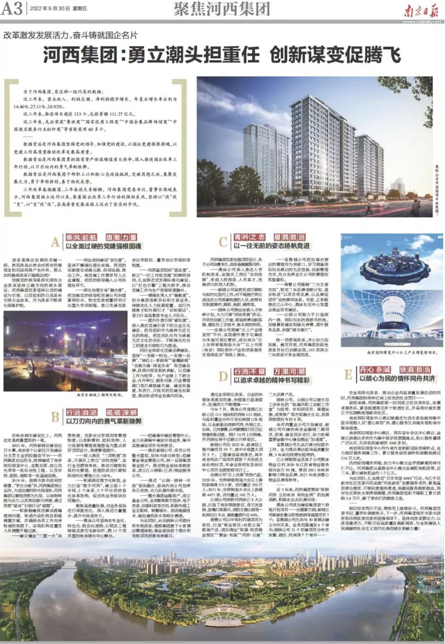 在南京城市建設(shè)史上,河西注定是濃墨重彩的一筆。2002年,河西新城區(qū)建設(shè)拉開大幕,南京首個以新區(qū)開發(fā)建設(shè)為主責(zé)主業(yè)的投融資平臺——河西集團應(yīng)運而生,陸續(xù)建成了南京國際博覽中心、青奧雙塔、濱江風(fēng)光帶等一批標志性工程,以及學(xué)校、醫(yī)院、道路等一批基礎(chǔ)設(shè)施。2019年,按照市委市政府的部署,“事企分離”后,河西集團獨立運作。為適應(yīng)激烈的市場競爭,河西集團以解放思想為先導(dǎo),以體制轉(zhuǎn)換為動力,以機制創(chuàng)新為突破,通過思想“破冰”引領(lǐng)行動“破題”?!e極穩(wěn)健規(guī)范解決混編混崗問題,形成內(nèi)設(shè)機構(gòu)及職能調(diào)整方案,在確保各項工作有序銜接的前提下,實現(xiàn)機構(gòu)設(shè)置及人員調(diào)整平穩(wěn)過渡。 ——建立健全“三重一大”決策制度、黨委會議事規(guī)則等管理制度;以戰(zhàn)略管控、組織架構(gòu)、人力資源等管理流程塑造為重點抓好頂層設(shè)計,倒逼管理提升。 ——深入推進“三項制度”改革,開展員工崗位“雙向選擇”,實行全員績效考核。推進任期制和契約化管理,經(jīng)理層成員任期制和契約化管理占比100%?!e極推進數(shù)字化轉(zhuǎn)型,全力打造“數(shù)字河西”,建立起1個專網(wǎng)、2個體系、3個平臺的信息化體系架構(gòu),促進各業(yè)務(wù)板塊協(xié)同融合。聚焦高質(zhì)量發(fā)展,對業(yè)務(wù)板塊進行深度優(yōu)化,深入推進力量整合,提升市場競爭力?!獖W體公司堅持走專業(yè)化、特色化、精品化道路,以精品工程鑄就品質(zhì)住宅新標桿,攜11個項目重回南京樓市中心舞臺?!M建集中建設(shè)管理中心,全力拓展集中建設(shè)市場業(yè)務(wù),集中實施建設(shè)項目有序推進?!七M新城公司、項目公司整合重組,加快市場化轉(zhuǎn)型;組建紫金商業(yè)管理公司,統(tǒng)一運營集團商業(yè)資產(chǎn);推進物業(yè)板塊戰(zhàn)略改革,成立江山智聯(lián)(江蘇)物業(yè)服務(wù)公司?!七M“公園—園林—市政”板塊融合,板塊內(nèi)各公司發(fā)揮各自優(yōu)勢,合力拓展外部市場。——整合集團金融資產(chǎn),成立基金公司,全面聚焦數(shù)字經(jīng)濟、電子信息、雙碳科技等方向,積極布局工業(yè)互聯(lián)網(wǎng)、智慧城市、清潔能源技術(shù)、綠色建筑技術(shù)等細分賽道。與此同時,啟動園林公司混合所有制改革;理順集團旗下6家酒店管理體制;商業(yè)板塊首個混合所有制項目招商有序展開。