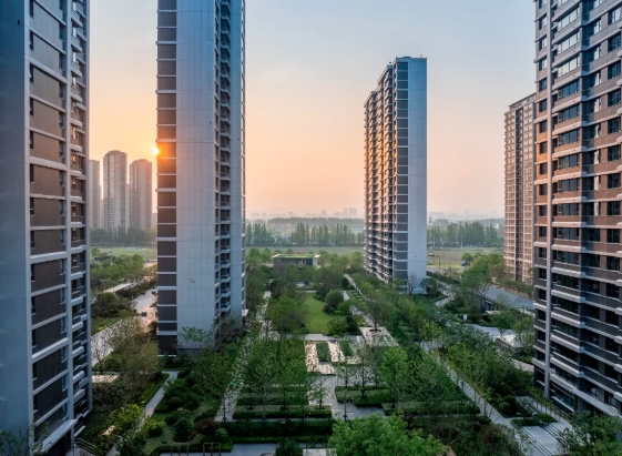 小區(qū)以1300平方米的陽光草坪為核心,烏桕林、櫻花林與低矮灌木穿插其間,形成“花葉共賞、四季生機(jī)”的浪漫花廊;烏桕林與水景水系則構(gòu)成“水榭林間”中央景觀軸,融入生態(tài)草坪設(shè)計(jì),增強(qiáng)了居民與自然的互動(dòng)體驗(yàn)。